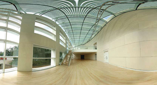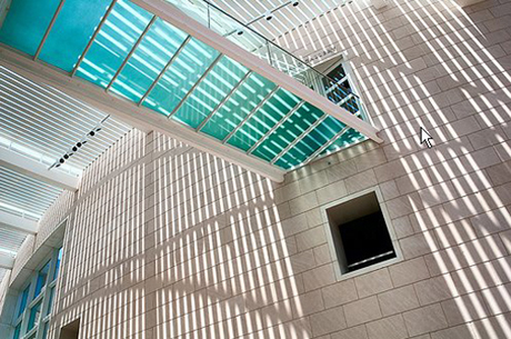 of sunlight and shadows into the atrium, giving the blond maple floors